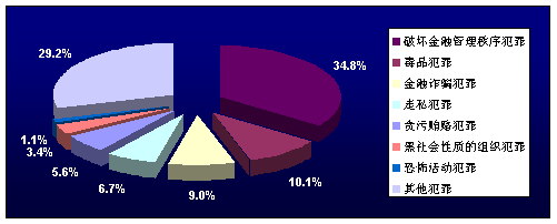 从破获洗钱案件涉及的上游犯罪类型进行分析,涉及破坏金融管理秩序犯罪的最多,约占总数的34.8%;其次是涉及毒品犯罪的,约占总数的10.1%;涉及非《刑法》规定上游犯罪的约占总数的29.2%(见下图)。