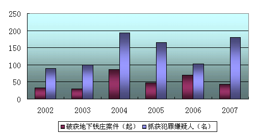 2007年,公安机关会同中国人民银行和外汇管理局等部门共组织50多次行动,破获43起重大地下钱庄案件,抓获犯罪嫌疑人180余名,涉案金额折合人民币114亿元,有力地遏制了此类犯罪的高发势头。例如,成功破获了深圳杜氏地下钱庄案、上海“2.07”专案、珠海万某贸易公司地下钱庄案、沈阳金某地下钱庄案等10余起重大案件,其中,广东侦破的地下钱庄案件数量占全国总量的三分之一。
