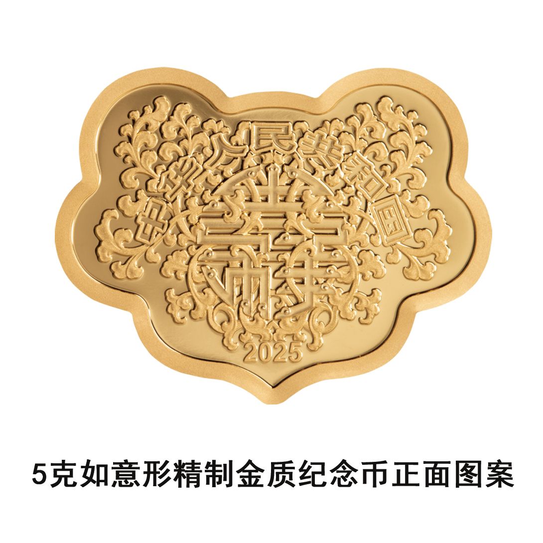 5克如意形金质纪念币为精制币,含纯金5克,外接矩形18毫米×24毫米,面额80元,成色99.9%,最大发行量10000枚。