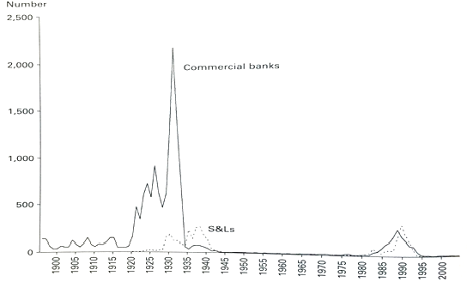 图1 1900-2000年美国银行业倒闭机构数量