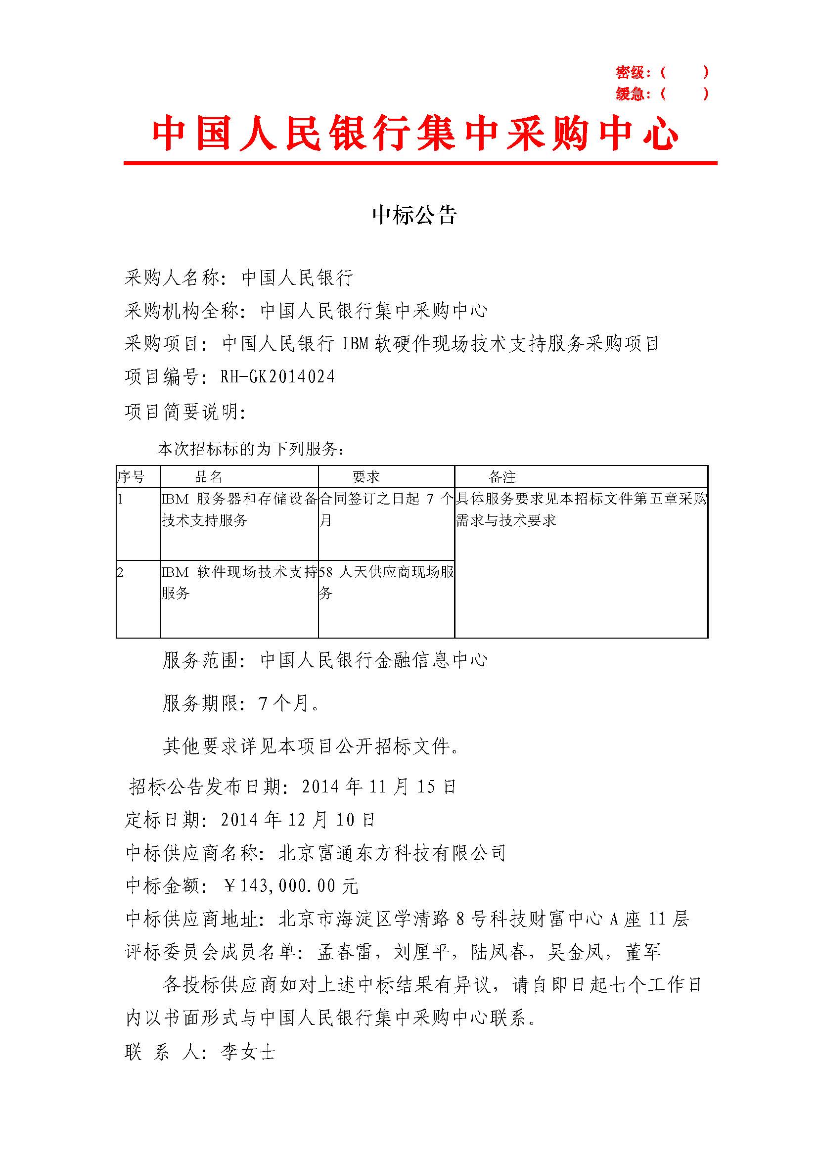 中国人民银行IBM软硬件现场技术支持服务采购项目 RH-GK2014024 中标公告