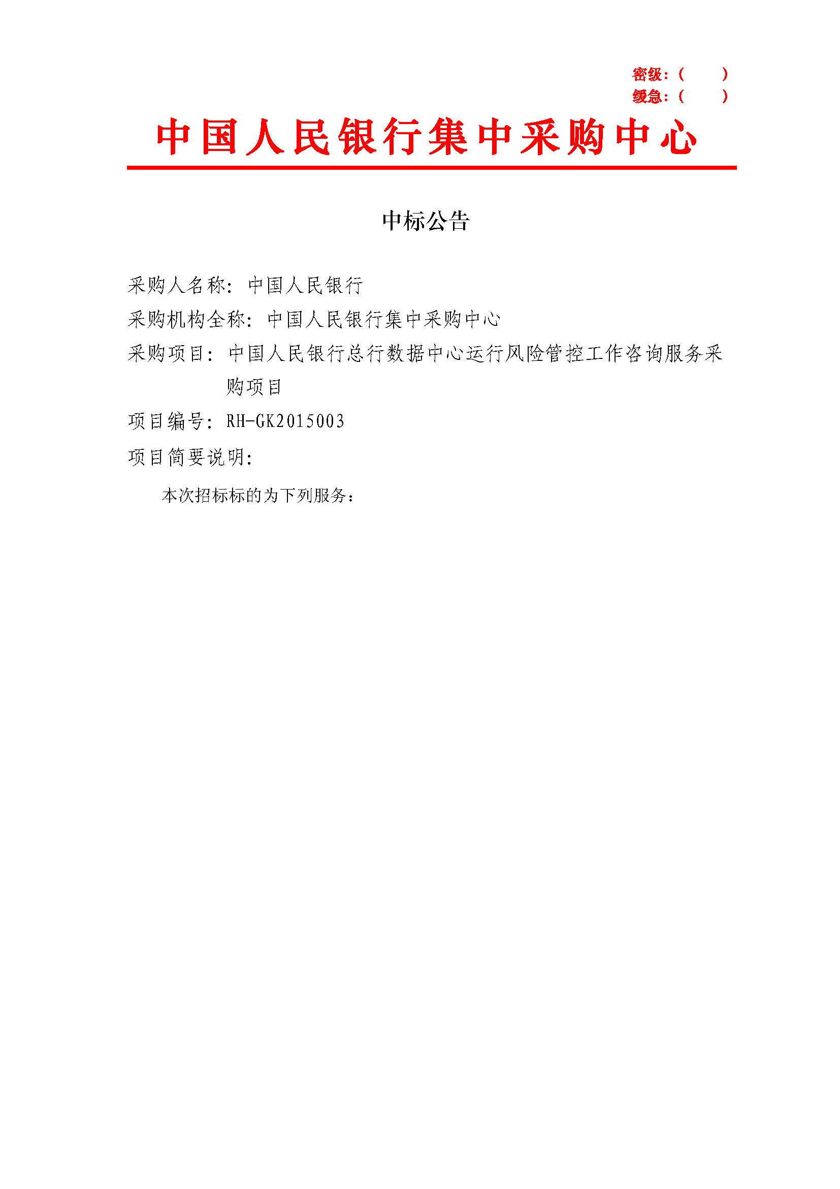 中国人民银行总行数据中心运行风险管控工作咨询服务采购项目 RH-Gk2015003 中标公告