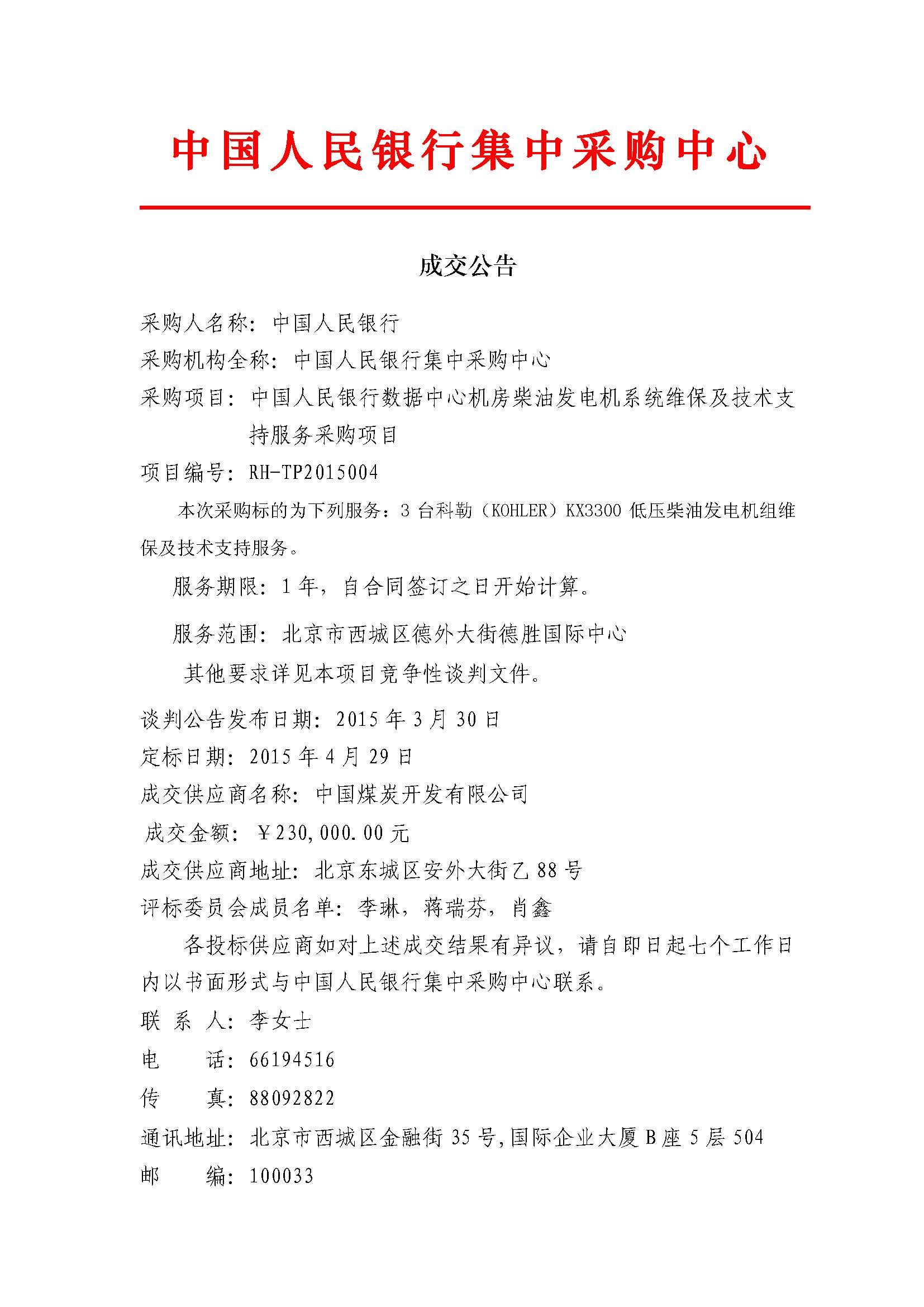 中国人民银行数据中心机房柴油发电机系统维保及技术支持服务采购项目 RH-TP2015004 成交公告