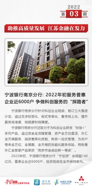 一、宁波银行南京分行:2022年初服务普惠企业近6000户 争做科创服务的“探路者”