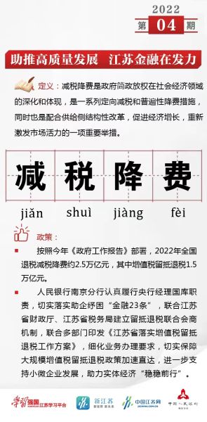 编者按:金融活,经济活;金融稳,经济稳。为进一步激发江苏金融活力,汇聚更多发展能量,由中国人民银行南京分行指导,“学习强国”江苏学习平台、中国江苏网、新江苏客户端联合推出《助推高质量发展 江苏金融在发力》特别策划,解读当下金融热词,介绍各机构生动实践,助力推动江苏金融高质量发展营造良好生态,以实际行动迎接党的二十大胜利召开。本期聚焦“减税降费”,一图了解江苏在减税降费工作实践中的高招、实招。