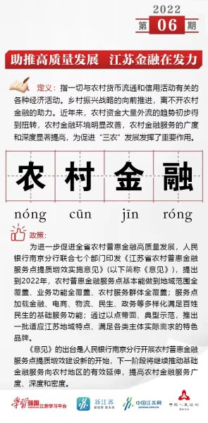 编者按:金融活,经济活;金融稳,经济稳。为进一步激发江苏金融活力,汇聚更多发展能量,由中国人民银行南京分行指导,“学习强国”江苏学习平台、中国江苏网、新江苏客户端联合推出《助推高质量发展 江苏金融在发力》特别策划,解读当下金融热词,介绍各机构生动实践,助力推动江苏金融高质量发展营造良好生态,以实际行动迎接党的二十大胜利召开。本期聚焦“农村金融”,一图了解江苏在农村金融工作实践中的高招、实招。