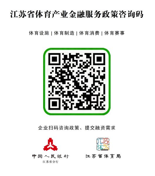 为深入贯彻中国人民银行、体育总局、金融监管总局、中国证监会《关于金融支持体育产业高质量发展的指导意见》,落实省委、省政府关于加快发展赛事经济提振体育休闲消费的部署要求,进一步加大银企融资对接力度,推动提升金融支持体育产业高质量发展融资服务质效,凡经营范围或服务对象与体育有关的企业均可通过“江苏省体育产业金融服务政策咨询码”提交融资需求、咨询金融政策、评价银行服务、提出意见建议。我们将尽快办理并通过微信小程序回复。
