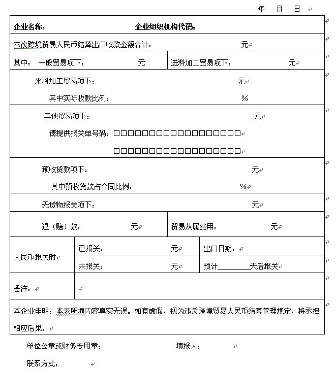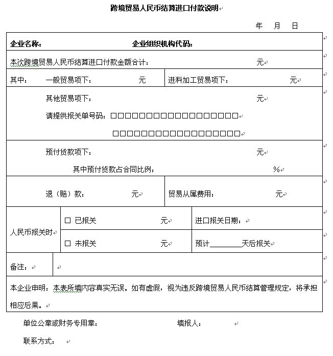 试点企业申请人民币支付业务时应当向其境内结算银行提供进出口报关时间或预计报关时间及有关进出口交易信息,如实填写跨境贸易人民币结算出口收款说明和进口付款说明(见附表),配合境内结算银行进行贸易单证真实性和一致性审核工作。