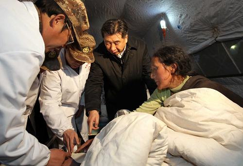 这是4月23日晚,回良玉来到结古镇体育场受灾群众安置点临时搭建的医院,看望受伤的藏族妇女。4月23日至24日,中共中央政治局委员、国务院副总理、国务院抗震救灾总指挥部总指挥回良玉深入玉树地震灾区,考察指导抗震救灾工作,看望慰问受灾群众,并连夜主持召开抗震救灾联席会议,传达胡锦涛总书记、温家宝总理近日关于抗震救灾的重要指示精神,重点研究部署灾后恢复重建前期工作。新华社记者刘卫兵 摄