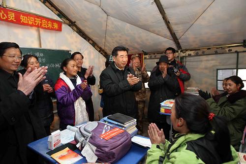这是4月24日,回良玉来到玉树州职业技术学校复课点看望师生。新华社记者 刘卫兵 摄