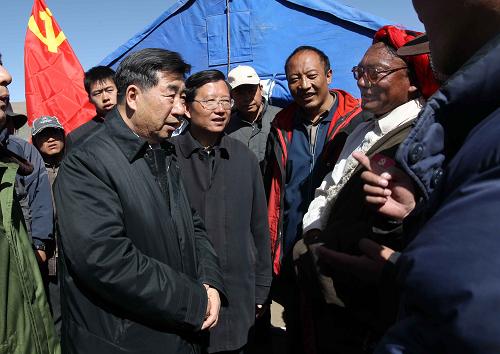 这是4月24日,回良玉一行驱车数百公里来到海拔4300多米、受灾十分严重的隆宝镇,看望慰问受灾的农牧区群众。新华社记者刘卫兵 摄