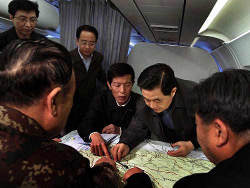玉树强烈地震发生后,正在国外访问的胡锦涛总书记对灾区群众万分牵挂,第一时间就做好抢险救灾工作作出重要指示,并当即决定提前结束访问回国。17日下午14时20分许,经过近25个小时长途飞行后,胡锦涛总书记从大洋彼岸回到北京。当天下午16时,总书记不顾旅途劳累,立即主持召开中央政治局常务委员会会议,听取抗震救灾工作汇报,研究部署下一步抗震救灾工作。18日一大早,总书记又乘飞机赶赴抗震救灾第一线。一上飞机,总书记就把随行的有关方面负责同志召集到一起,打开地图,详细询问玉树抗震救灾最新情况,讨论研究具体办法对策。