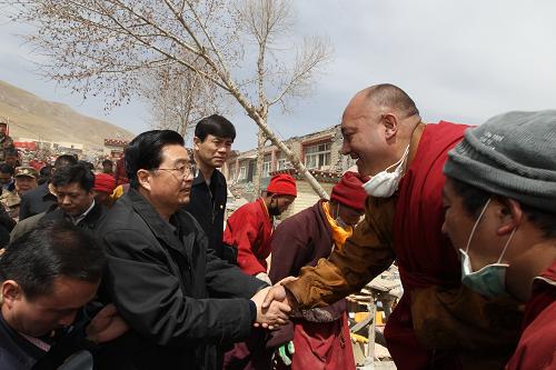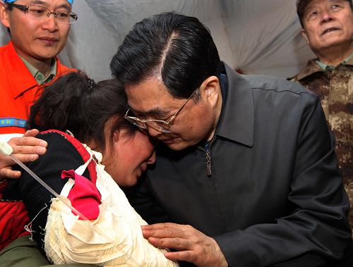 这是胡锦涛亲切慰问受灾群众(4月18日摄)。 新华社记者兰红光摄