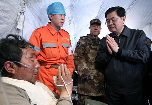 胡锦涛接着说:“地震无情,人间有爱。党中央和灾区群众心连心,我们已经从全国抽调了大批救援人员来到玉树,抢救被困人员,及时救治伤员。我们还要安排好乡亲们的生活,让大家有饭吃、有水喝、有住所、有御寒衣被,尽快解决学生的复课问题,并帮助你们把新房建起来。”
