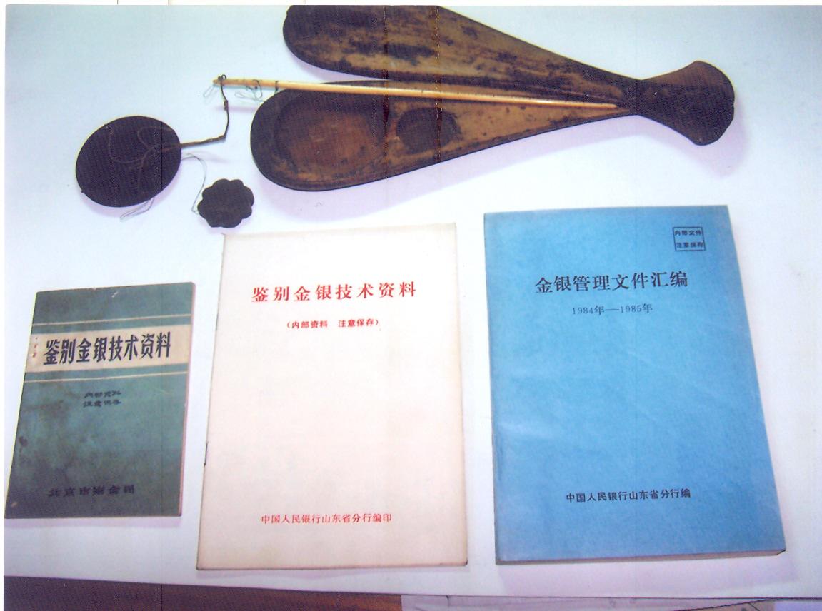 1974年,我已在会计发行组任组长,“文革”期间,各县行收兑金银的工作人员变化较大,我们组织人员进行培训,培训资料选用的是1972年天津财金局编印的《鉴别金银技术资料》和山东省人民银行印发的《鉴别金银技术资料》,鉴别金银的工具,主要用试金石和金银对牌(图二),靠手和眼力。