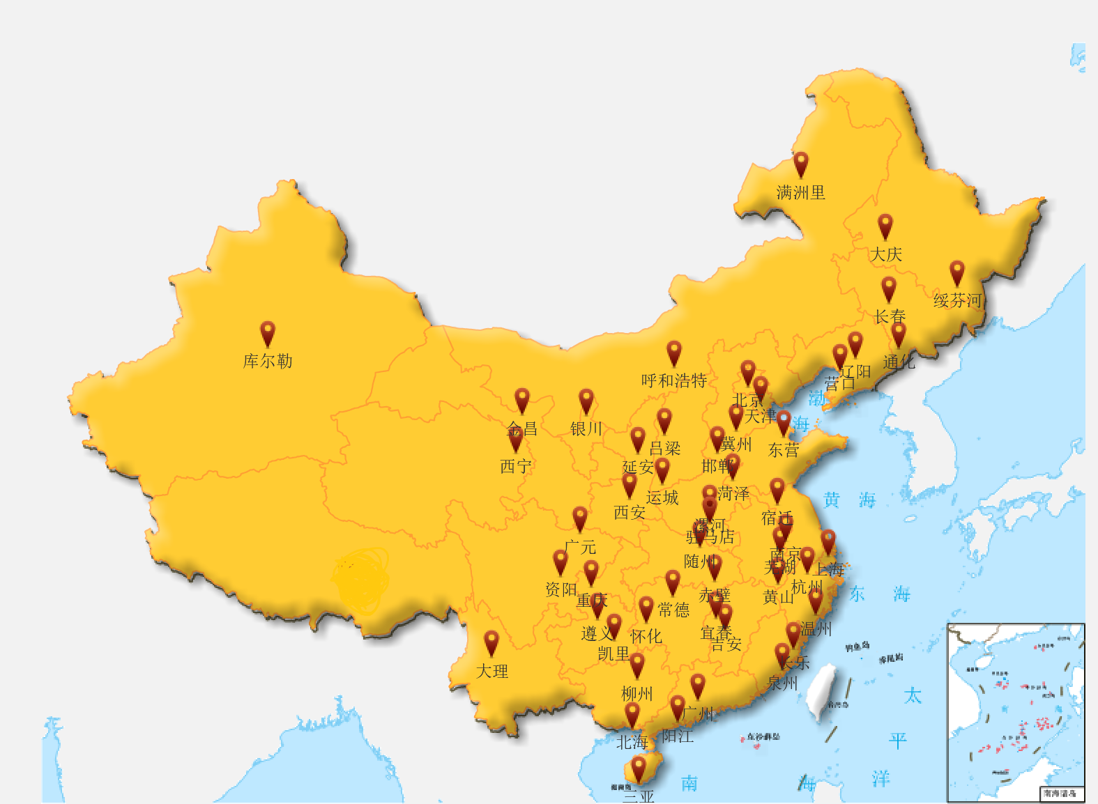 34个地级市:邯郸、运城、吕梁、呼和浩特、满洲里、辽阳、营口、通化、大庆、宿迁、温州、芜湖、黄山、泉州、宜春、吉安、东营、菏泽、漯河、驻马店、随州、常德、怀化、阳江、柳州、北海、三亚、广元、资阳、遵义、延安、金昌、西宁、银川