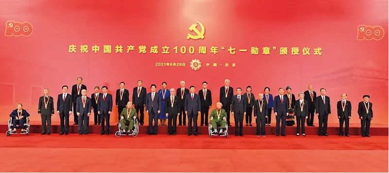 2021年6月29日,庆祝中国共产党成立100周年“七一勋章”颁授仪式在北京人民大会堂金色大厅隆重举行。习近平等领导同志同“七一勋章”获得者合影。 新华社记者 谢环驰/摄