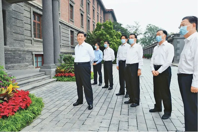 2021年6月25日,中共中央政治局就用好红色资源、赓续红色血脉举行第三十一次集体学习。这次集体学习采取参观和讨论相结合的形式,这是习近平、李克强、栗战书、汪洋、王沪宁、赵乐际、韩正等在北大红楼参观“光辉伟业 红色序章——北大红楼与中国共产党早期北京革命活动主题展”。 新华社记者 谢环驰/摄