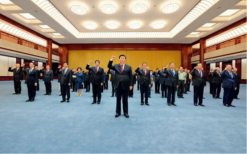 2021年6月18日,党和国家领导人习近平、李克强、栗战书、汪洋、王沪宁、赵乐际、韩正、王岐山等在中国共产党历史展览馆参观“‘不忘初心、牢记使命’中国共产党历史展览”。这是参观结束后,习近平带领党员领导同志一起重温入党誓词。 新华社记者 李学仁/摄