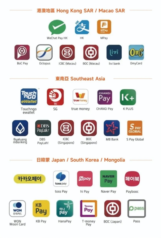 1.您可直接使用本地熟悉的钱包支付,无需另行开户或下载境内APP。