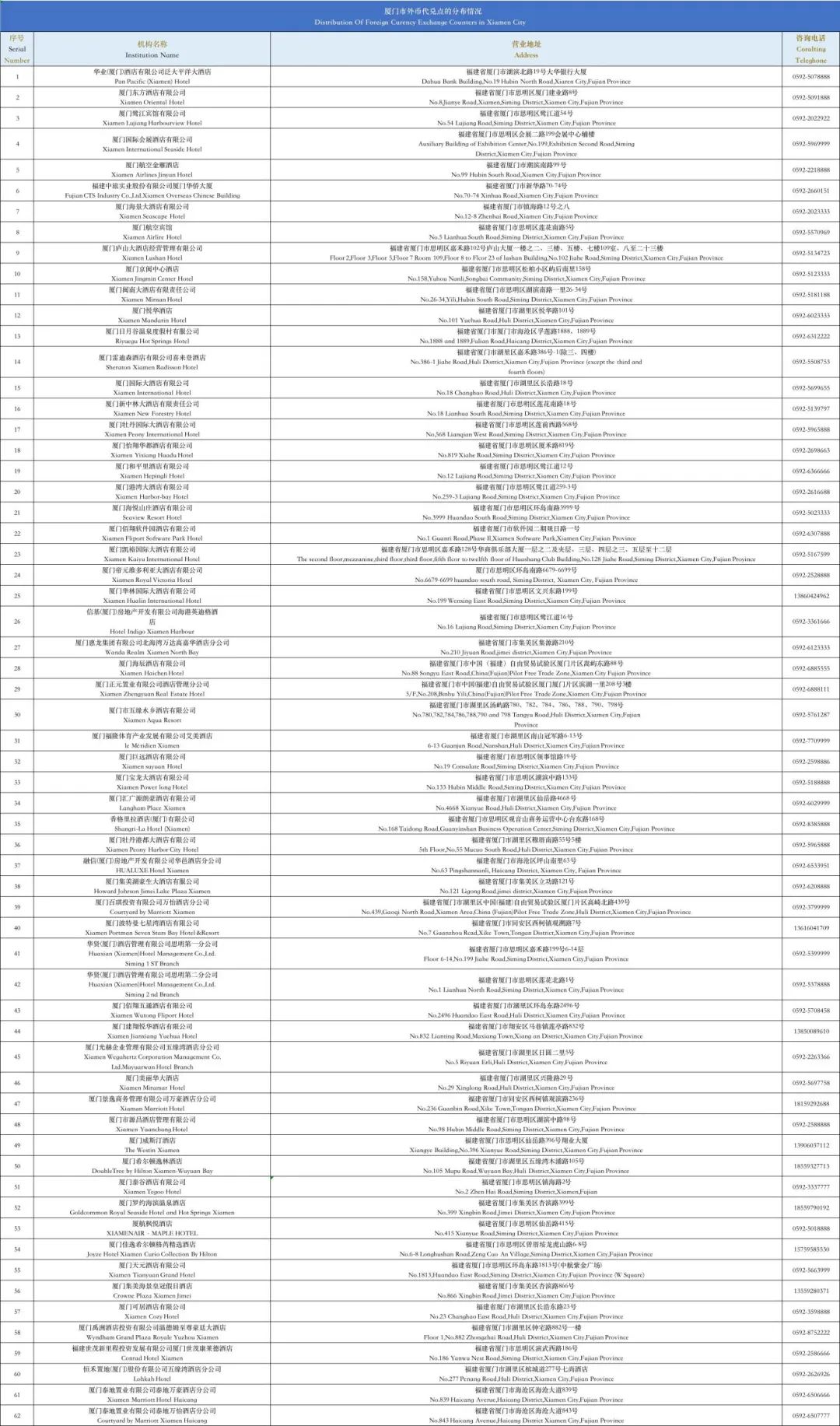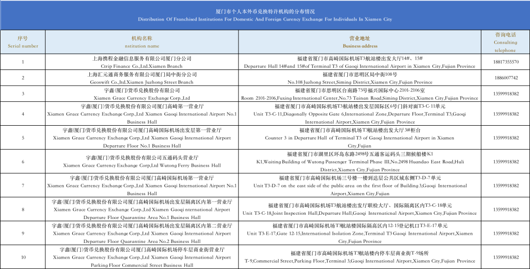 Currently, there are 62 exchange agencies throughout Xiamen.Commonly found in foreign-related hotels and other places, it supports one-way exchange of foreign currency cash into RMB cash. Each person's daily exchange does not exceed the equivalent of 10000 RMB, and the annual exchange does not exceed the equivalent of 50000 RMB.