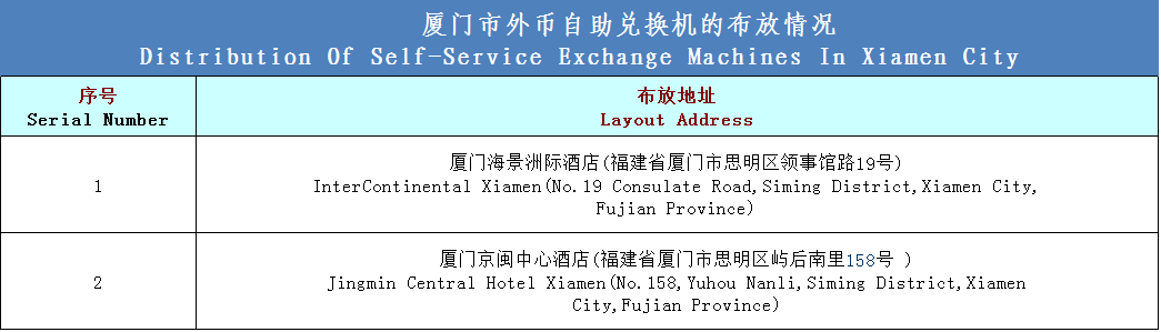目前,全厦门有2台自助兑换机。您可持个人有效身份证件通过自助兑换机将外币现钞兑换人民币现钞。每人每日兑换不得超过等值5000元人民币。