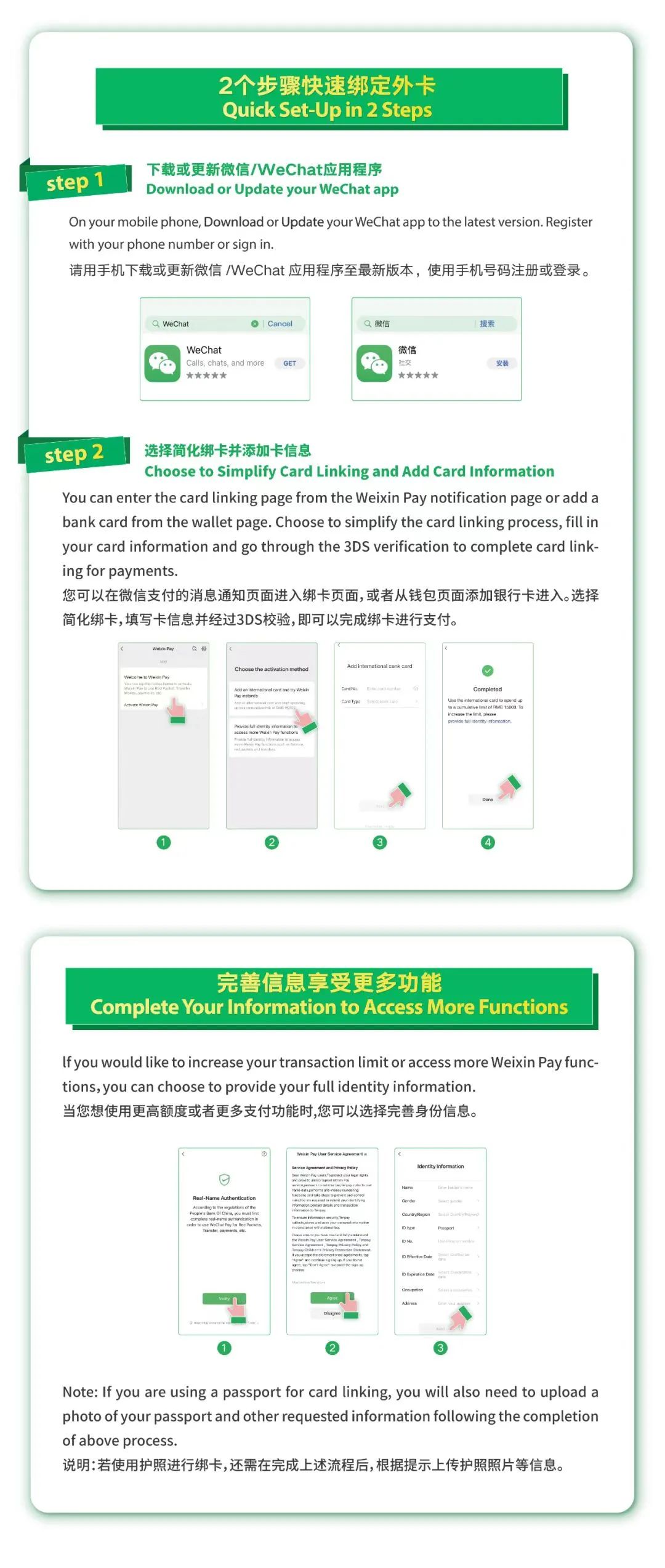 If you don't have time to submit complete identity information at the moment and want to use mobile payment immediately, you can use authentication free small payment. You can also choose to continue submitting authentication information according to your own needs to increase transaction limits and experience complete services.
