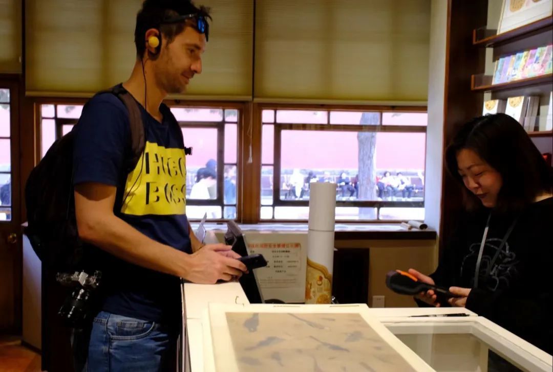 “故宫文化太棒了!”4月7日下午,一对年轻的意大利游客逛完故宫景区后,走进了一家影像品文创商店,对着一幅标价700元的高清喷绘山水画仔细端详并情有独钟。决意要买后,他打开手机里的支付软件进行扫码,最终完成了交易,将心仪之物收入囊中。