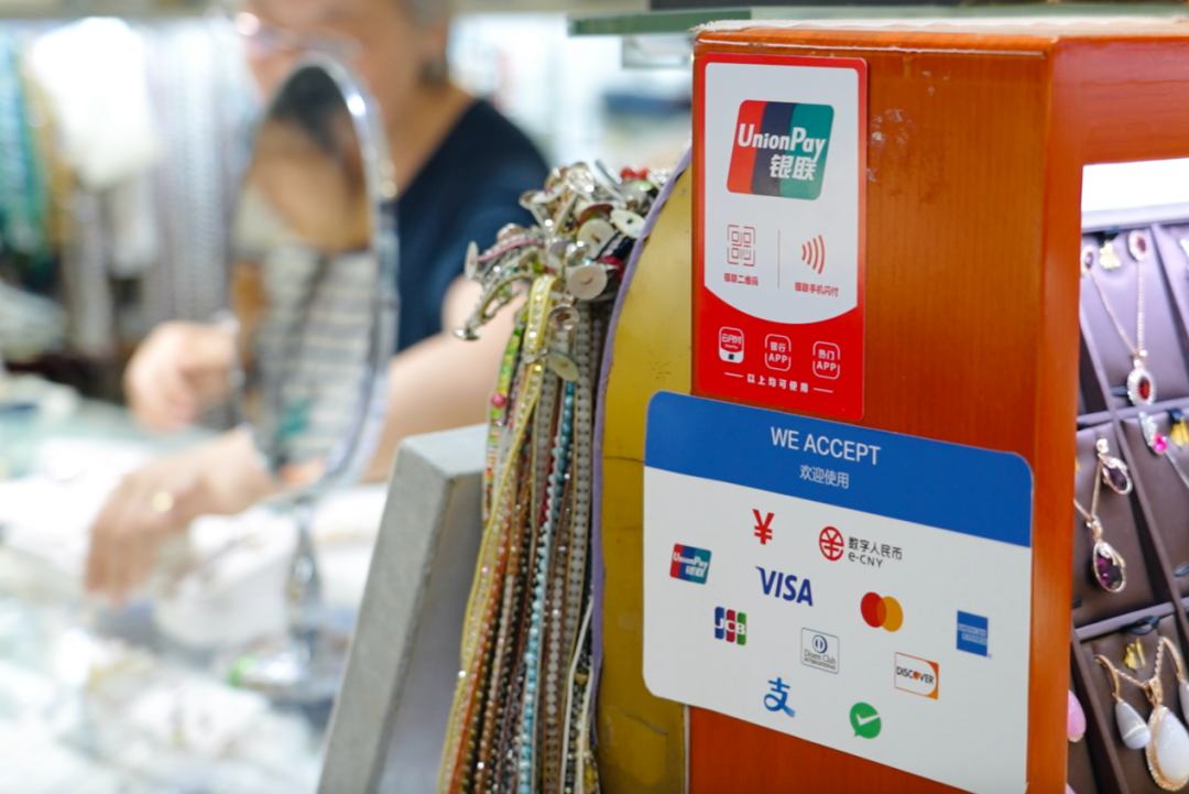 在天坛附近的红桥市场,北京商报记者走近摊位注意到,柜台上张贴的标识清晰指出,这里接受人民币现金、银联卡、Visa等国际银行卡以及数字人民币、云闪付、支付宝、微信支付。同时,银联可支持众多境外钱包付款。