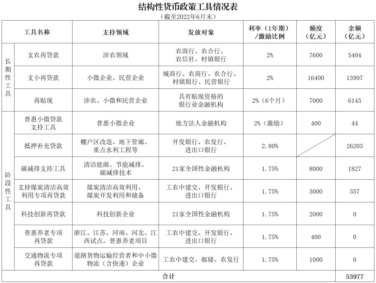 结构性货币政策工具情况表(截至2022年6月末)